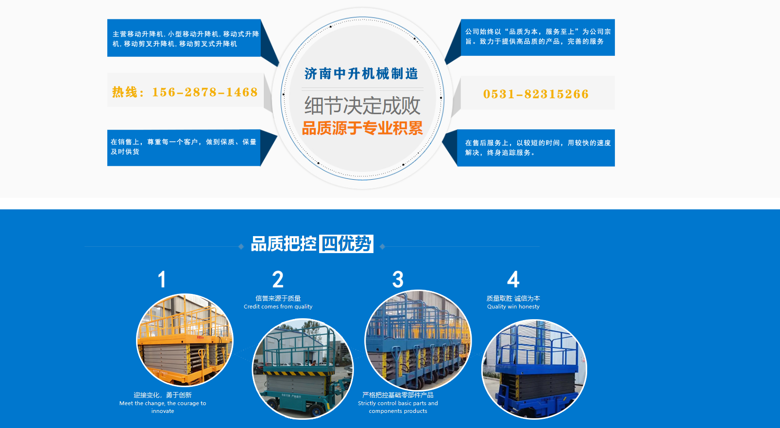 濟(jì)南中升機(jī)械制造有限公司主營(yíng)移動(dòng)升降機(jī),小型移動(dòng)升降機(jī),移動(dòng)式升降機(jī),移動(dòng)剪叉升降機(jī),移動(dòng)剪叉式升降機(jī)等產(chǎn)品,信譽(yù)良好,歡迎前來咨詢訂購(gòu)! 在銷售上,尊重每一個(gè)客戶,做到保質(zhì)、保量及時(shí)供貨;在售后服務(wù)上,以較短的時(shí)間,用較快的速度解決,終身追蹤服務(wù)。 公司始終以“品質(zhì)為本,服務(wù)至上”為公司宗旨。致力于提供高品質(zhì)的產(chǎn)品,完善的服務(wù),快捷的供貨,無論您身處何方,都能感受到我們的優(yōu)良服務(wù)。客戶至上,誠(chéng)信為本。 歡迎各界朋友來電,來函垂詢,選購(gòu)!...